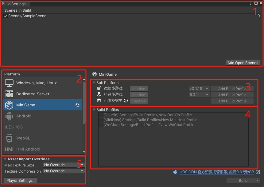 Build Settings 界面是构建小游戏的核心入口,负责设置目标平台、设置并启动构建过程。其界面主要由以下五部分组成: