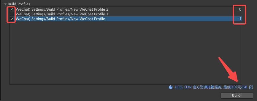 | Build Profiles | 列出 Build Profile 文件。勾选后,点击右下角的 Build 按钮,系统会依次处理所选文件。 |