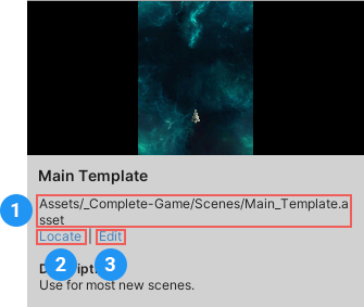 当您在 New Scene 对话框中选择模板时,详细信息窗格会显示模板的路径(下图中的 1)。