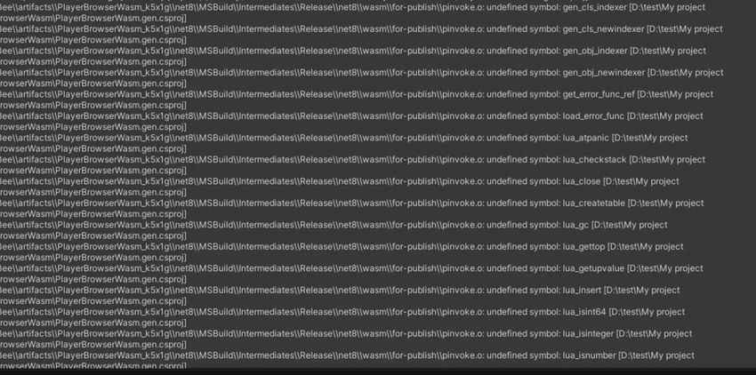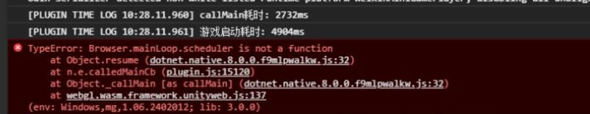 EM_CONFIG、EM_SDK 等。需要删除所有相关环境变量,以免 DotNet Wasm 编译命中旧版本库,因版本不匹配导致奇怪的编译失败。WeixinMiniGameSupport/BuildTools/DotNetWithWasm/packs/Microsoft.NET.Runtime.Emscripten.3.1.34.Sdk.linux-x64/8.0.0/tools/bin/wasm-opt,如果有复现 undefined symbol,考虑 remove 已安装的 emscripten/binaryen 相关工具链,或更改 LD_LIBRARY_PATH 确保命中正确库。Browser.mainLoop.scheduler is not a function
