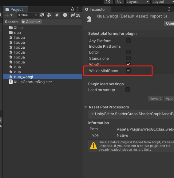 解决方法为 xlua_webgl 勾选目标平台 WeixinMiniGame