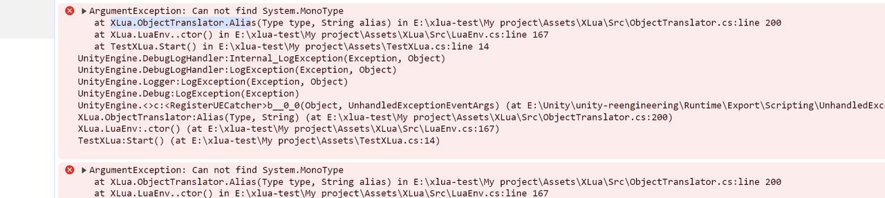 解决方法为:注释掉 xLua 中 LuaEnv.cs 脚本中关于 MonoType 的代码。