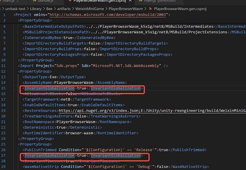 InvariantGlobalization 目前设为 true,也就是默认 culture default 不变的模式,可以在 Library\Bee\artifacts\WeixinMiniGame\PlayerBrowserWasm\PlayerBrowserWasm.gen.csproj 更改。更改后会引入 dat,需要关注导出产物大小。InvariantGlobalization key,手动更改为 false,并在这个下方手动添加一行 <WasmIcuDataFileName>icudt_[xxx].dat</WasmIcuDataFileName> ,具体需要根据加载的语言选择dat文件,参考 Wasm 全球化相关文档。