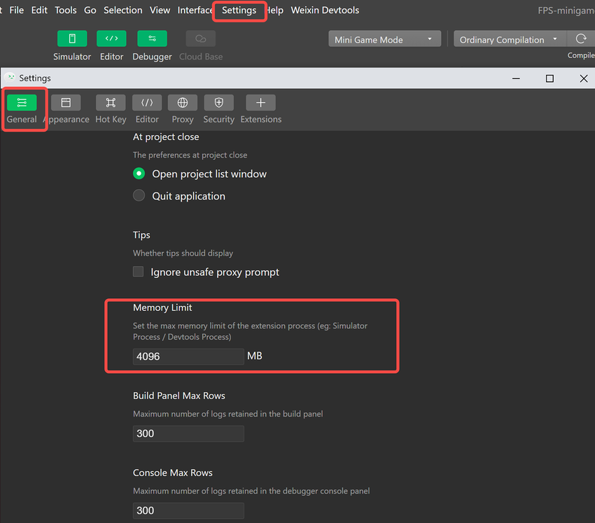 如果项目较大,开发者工具崩溃,请增加开发者工具内存限制