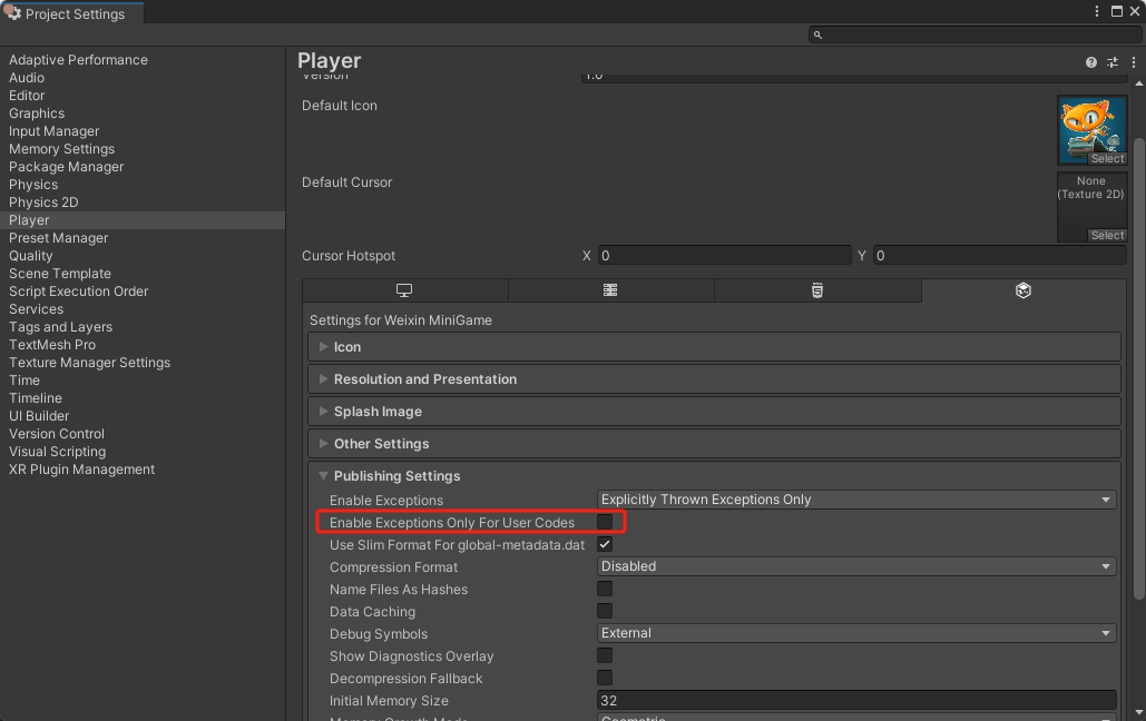 当启用异常时(即 Enable Exceptions 不为 None ),勾选 Enable Exceptions Only For User Codes ,则仅对用户的 C# 代码和 Library 开启异常支持,其他部分(包括 IL2CPP Runtime、系统 CoreLib、Builtin Library)关闭异常支持;