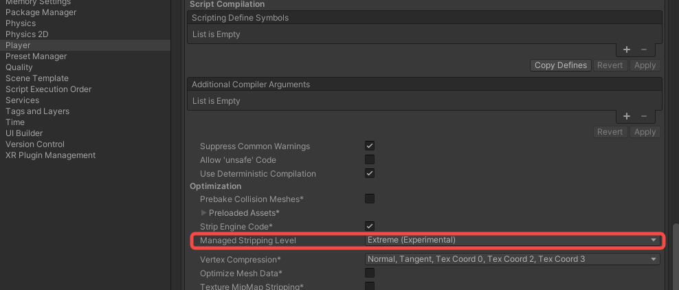 团结引擎小游戏平台新增了 Extreme 级别的托管代码剪裁策略,基于对MonoBehaviour和ScriptableObject类深入静态分析,尽可能多的剔除代码。