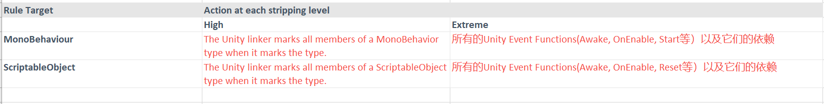 Managed Code 剔除会对代码进行静态分析。首先依据 root marking rules 标记root类型、方法、属性等,然后再依据 dependency marking rules 去标记这些root的依赖。接下来未被标记的代码会被剔除。新增的 Extreme Level,使用了更加激进的标记规则,与 High Level 对比如下: