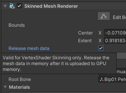 通过 multi_compile 添加 keyword 时,SkinnedMeshRenderer 会根据 Player Settings 自动启用 keyword。如果确定该 shader 只会使用 VS Skinning,且不希望生成禁用此 keyword 的变体,可以通过 shader_feature 添加 keyword。但此时需要添加 Material Inspector,并确保 keyword 处于启用状态,详情可参见 MaterialPropertyDrawer。示例: