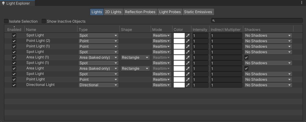 Use the four tabs at the top of the panel to view settings for the Lights, 2D Lights, Reflection Probes, Light Probes, and Static Emissives in the current Scene. The editable parameters are the most commonly-used fields for each component type.