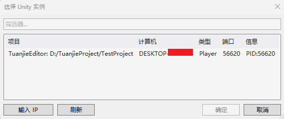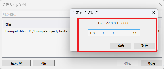 在弹窗中输入对应 Tuanjie 实例的 IP 和 端口号,点击确定即可进行连接