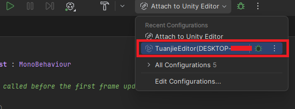 To attach your code editor to the Tuanjie Player, in your code editor, select the IP address (or machine name) and port of your Player. For an example of where to find this in Visual Studio, see Attach Visual Studio to the Tuanjie Editor.