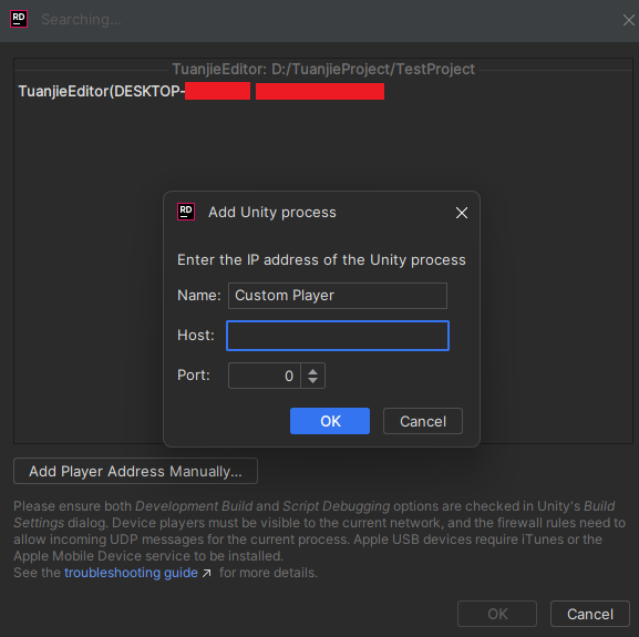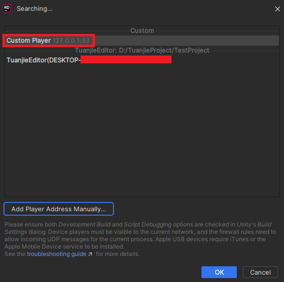 该界面会显示 Rider 找到的 Tuanjie 实例和手动添加的 IP,之后可以选择自己需要连接的 Tuanjie 实例,点击 OK 进行连接即可
