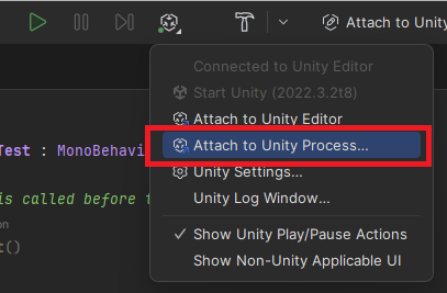 当你连接完成之后,只需要让 Tuanjie Editor 进入 Play Mode 就可以对代码进行调式。