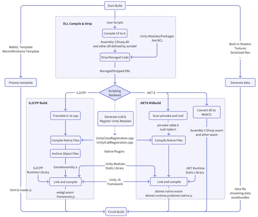 如上图,.NET 8 构建环节与 IL2CPP 基本相同相同,区别主要在构建 Wasm 的方式和产物。下面我们对 DotNet Wasm 方案构建流程逐步展开描述: