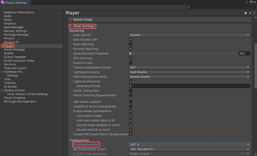 • 点击 Player Settings -> Other Settings,根据需求调整编译设置,Scripting Backend 可选项为 .NET 8 或者 ILCPP