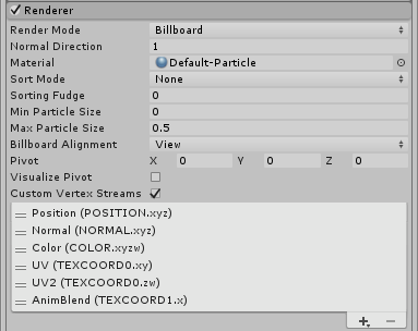 使用 Tangent 流来支持法线贴图粒子。 可以删除 Color,然后添加 Tangent UV2 和 AnimBlend 流以便在粒子上使用标准着色器。 * 需要轻松执行翻页动画的线性纹理混合,请添加 UV2 和 AnimBlend 流,并附加粒子/动画 Alpha 混合着色器 (Particles/Anim Alpha Blended Shader)(请参阅下面的示例截屏,了解如何对其进行设置)。