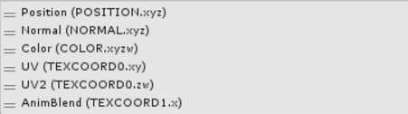 添加顶点流时,Unity 会在每一项旁边的括号中提供一些信息,用于在着色器中读取正确的数据: