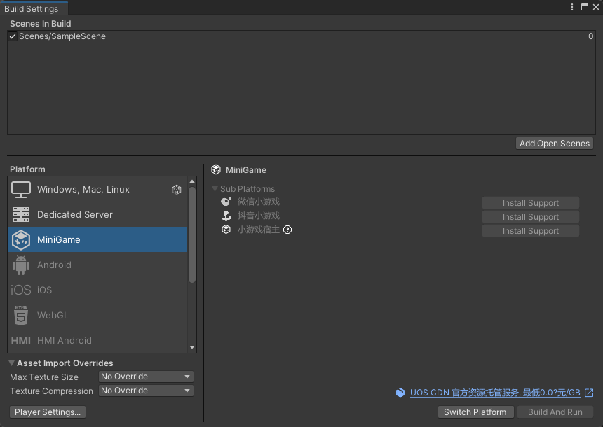注: 该步骤不限于 UOS CDN,可以使用本地的或者自己的服务器,只需将游戏资源 CDN 替换为自己的 URL 地址。