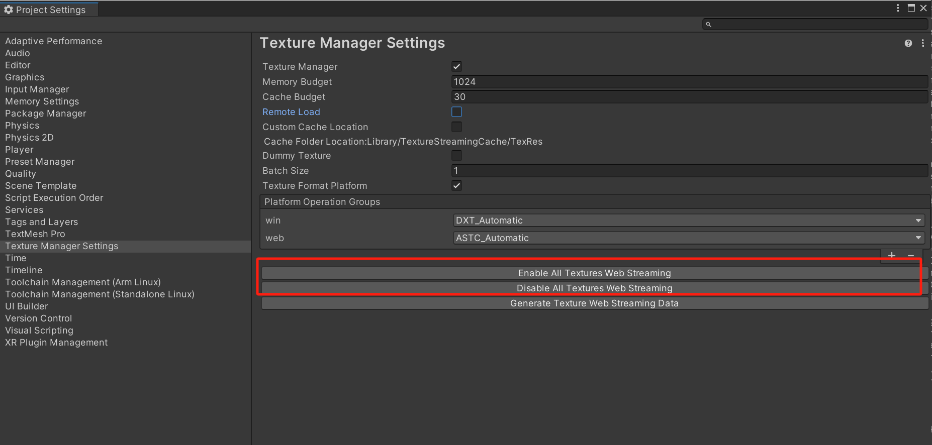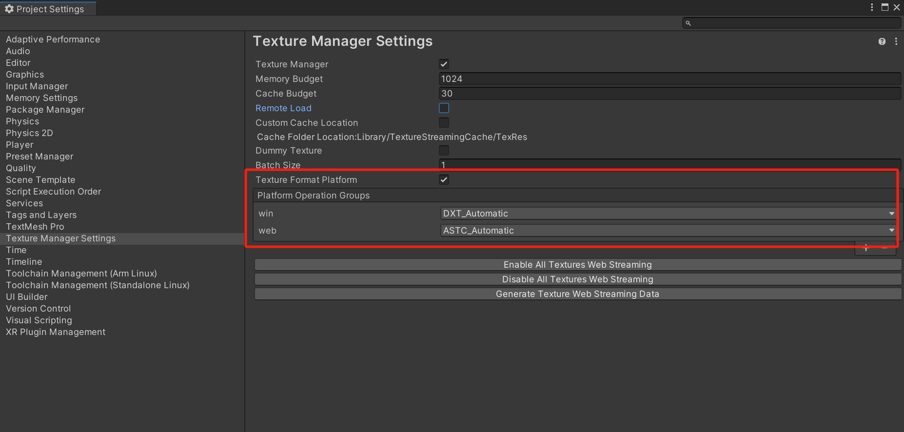 不同平台的贴图压缩格式有各自的设置,需要确保 Texture Manager 的 WebStreamingData 能够适配不同的平台。