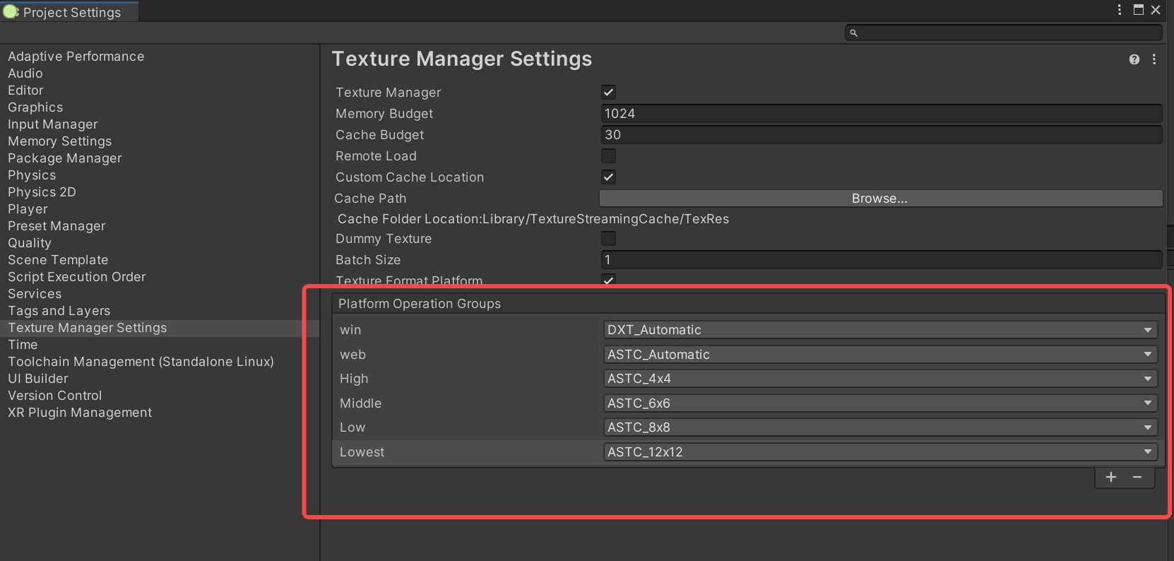 通过开启 Texture Format Platform 的支持,我们可以针对不同平台定制对应格式如下图所示:
