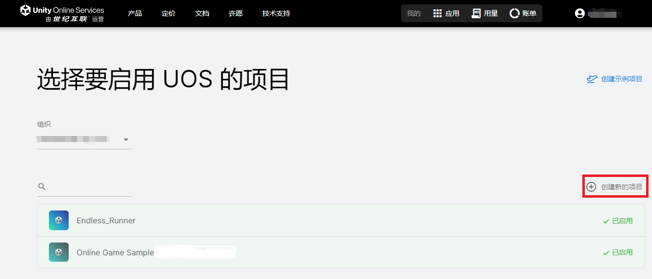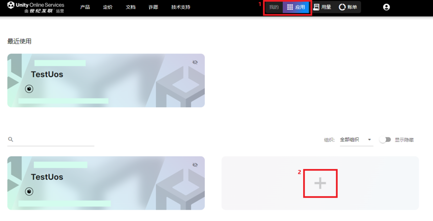 • 在页面上方前往 我的应用,点击灰底的 + 选项卡,会跳转至显示 Unity 项目列表的页面。