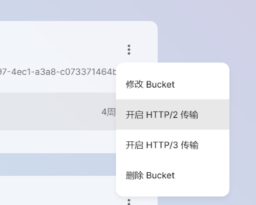 如果有使用 HTTP/2 或 HTTP/3 协议的需求,请前往UOS CDN网站,找到游戏使用的项目和bucket,点击右上角的三个小点,选择 开启 HTTP/2 传输 或者 开启 HTTP/3 传输。