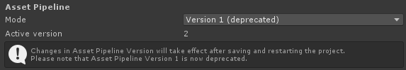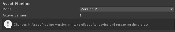 Selecting Version 2 will tell the editor you now want to use the new Asset Import Pipeline together with this project, and restarting your project will re-import it using the new Asset Import Pipeline code. This essentially has the same effect as deleting your Library folder, but without deleting it. When switching to use Asset Import Pipeline V2, the Import Results from the original Asset Import Pipeline are not deleted as V2 creates its own folder structure to store its Import Results. Projects that you’ve created in Unity 2019.2 or older will still use their original Asset Import Pipeline by default. When opening such a project in Unity 2019.3 for the first time, you’ll get an option to upgrade to the new Asset Import Pipeline. If you decline, your project will continue using the original Asset Import Pipeline. Furthermore, the selected version is stored in the EditorSettings.asset file of your project, so it can be version controlled.