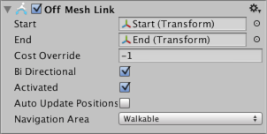 | Auto Update Positions | When enabled, the OffMesh link will be reconnected to the NavMesh when the end points move. If disabled the link will stay at its start location even if the end points are moved. |