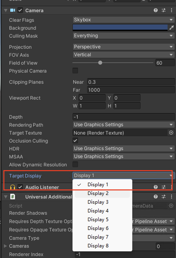 在该 Camera 的 Inspector 面板中,找到 Camera 下的 Target Display 参数