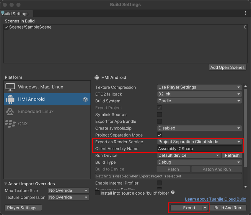 将 [Export as Render Service] 设置为 Project Separation Client Mode