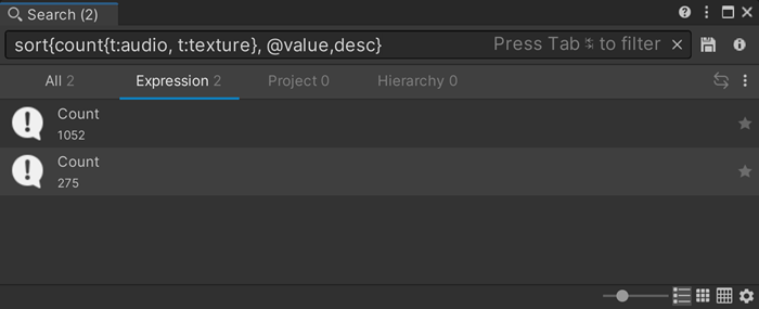 sort{t:texture, @#height}: sorts all textures in order of their height serialized properties.You can name search expressions to make them easier to display in the Search window.