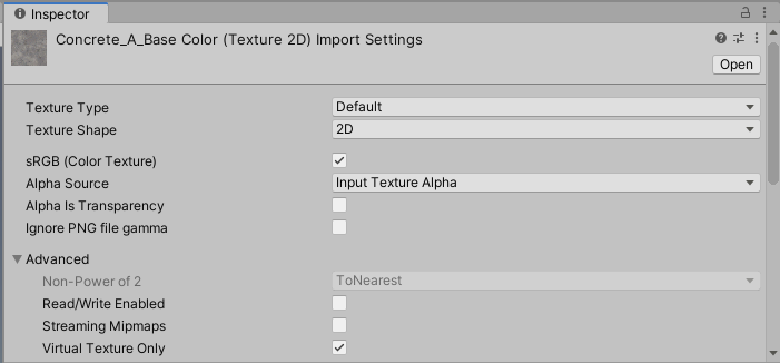 在 Unity 编辑器中,您可以将纹理标记为仅由虚拟纹理使用。这样可以优化内存使用和场景加载时间,并减少了构建的大小。要将纹理标记为仅由虚拟纹理使用,请打开其纹理导入器并启用 Virtual Texture Only