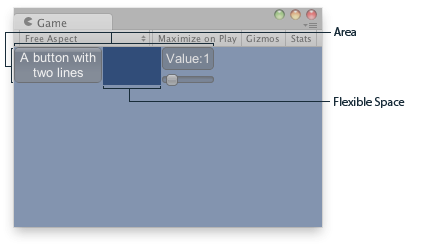 void OnGUI() { // Wrap everything in the designated GUI Area GUILayout.BeginArea(new Rect(0, 0, 200, 60)); // Begin the singular Horizontal Group GUILayout.BeginHorizontal(); // Place a Button normally GUILayout.RepeatButton("A button with\ntwo lines"); // Place a space between the button and the vertical area // so it fits the whole area GUILayout.FlexibleSpace(); // Arrange two more Controls vertically beside the Button GUILayout.BeginVertical(); GUILayout.Box("Value:" + Mathf.Round(sliderValue)); sliderValue = GUILayout.HorizontalSlider(sliderValue, 0.0f, 10f);