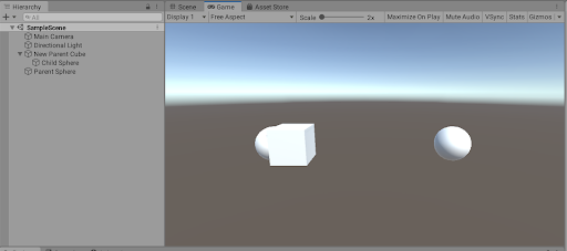 Notice how the Child Sphere is in the same position but now relative to the New Parent Cube.