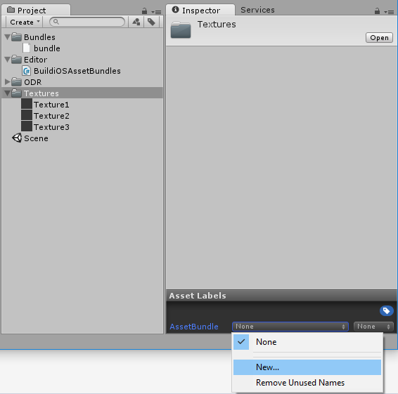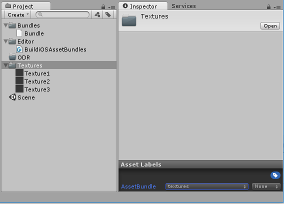 在此示例中,为 Textures 文件夹赋予了标签 textures。在 Editor 文件夹中创建了新脚本 BuildiOSAssetBundles.cs。