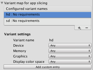 现在可以在 Player Settings > Other Settings > Configuration 中的 Variant map for app slicing 下拉菜单中查看和修改变体(仅当在 Player Settings 中启用了 Use on demand resources 时,此菜单才可见)。