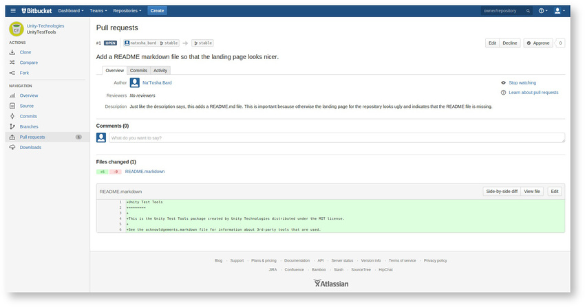 这次,单击 Create Pull Request 链接。随后将进入一个页面,该页面自动汇总传出的变更集并显示它们的差异(“差异”显示两个版本之间的差异或变化)。您还可以添加描述(建议这样做!)和任何评论: