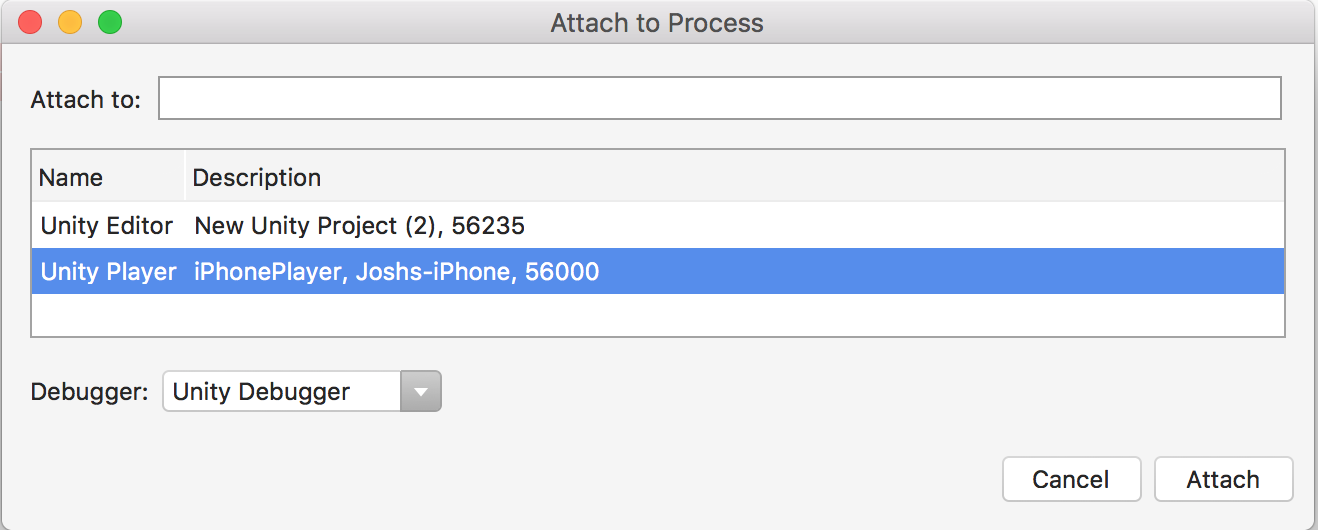 To debug a Unity Player running on an iOS device, connect to the device using TCP. For example, to connect to an iOS device in Visual Studio for Mac, select Debug > Attach Unity Debugger. A list of devices running a Player instance appears.