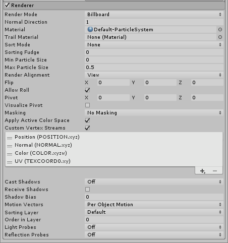 | Custom Vertex Streams | 配置材质的顶点着色器中可用的粒子属性。有关更多详细信息,请参阅粒子顶点流。 |