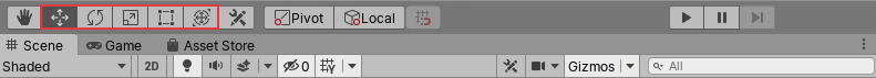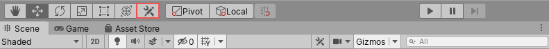 变换__工具组合了__移动、旋转__和__缩放__工具。该工具的辅助图标提供了用于移动和旋转的控制柄。当 Tool Handle Rotation__ 设置为 __Local__(见下方)时,变换组件工具还提供用于缩放所选游戏对象的控制柄。