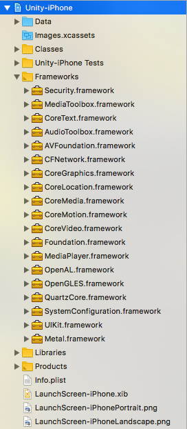 Libraries 文件夹包含用于 IL2CPP 的 libil2cpp.a。libiPhone-lib.a 文件是 Unity Runtime 静态库,_RegisterMonoModules.cpp_ 将 Unity 原生代码与 .NET 绑定。Xcode 在每次构建时都会刷新此文件夹的内容。您不应对其进行任何更改。