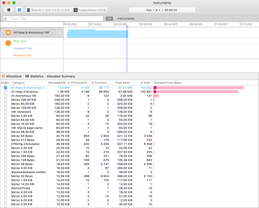 注意:内部性能分析器仅显示 .NET 脚本分配的堆。总内存使用量可以通过 Xcode Instruments 来确定,如上所示。此图包括应用程序二进制文件、一些标准框架缓冲区、Unity 引擎内部状态缓冲区、.NET 运行时堆(由内部性能分析器输出的数字)、GLES 驱动程序堆和其他一些杂项内容等多个部分。