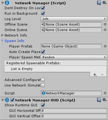 2.向空游戏对象添加 NetworkManager 和 NetworkManagerHUD 组件。将此对象重命名为“Network Manager”以表明其用途。