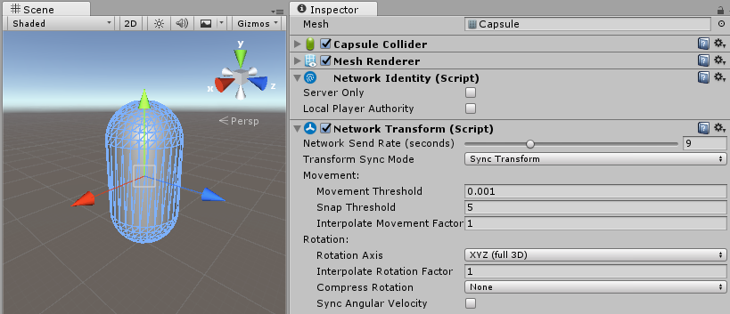 4.向玩家预制件添加 NetworkIdentity 和 NetworkTransform 组件。NetworkTransform 组件可同步玩家游戏对象的移动。如果要开发玩家不会移动的游戏,则不需要此组件。