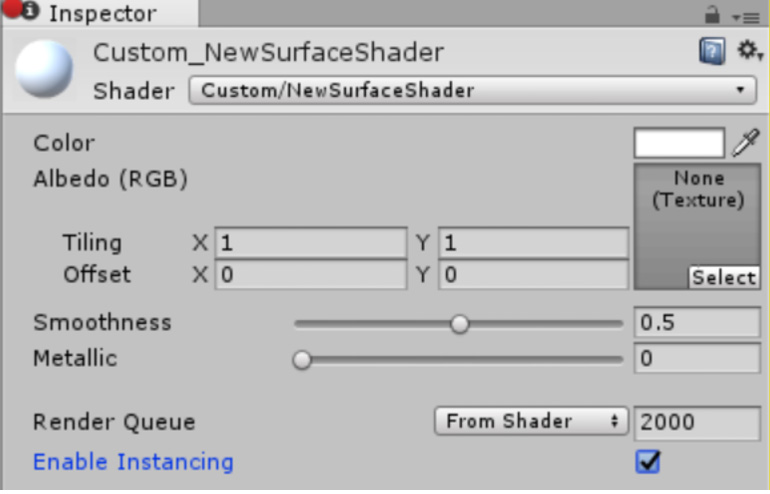 现在必须为用于 GPU 实例化的所有材质选中新的 Enable Instancing 复选框。这是确保 GPU 实例化正常工作的必要条件。