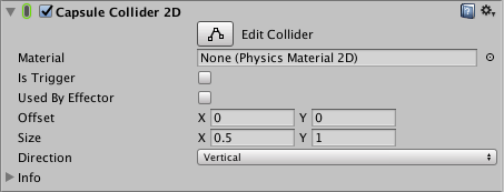 A typical way to set up the Capsule Collider 2D is to set the Size to match the Direction. For example, if the Capsule Collider 2D’s Direction is Vertical, the Size of X is 0.5 and the Size of Y is 1, this makes the vertical direction capsule taller, rather than wider.
