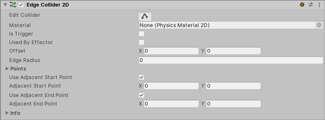 The Edge Collider 2D component is a Collider that interacts with the 2D physics system. The Collider’s shape is a freeform edge made of line segments that you can adjust to fit the shape of a Sprite or any other shape. The Collider’s start and end points do not need to meet or completely enclose an area to function (unlike the Polygon Collider 2D), and can form a straight line or other single edge shape.