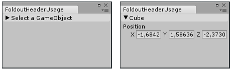 public class FoldoutHeaderUsage : EditorWindow { bool showPosition = true; string status = "Select a GameObject";