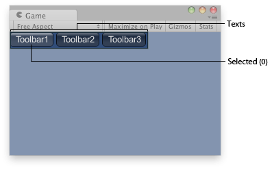 public class ExampleScript : MonoBehaviour { int toolbarInt = 0; string[] toolbarStrings = {"Toolbar1", "Toolbar2", "Toolbar3"};