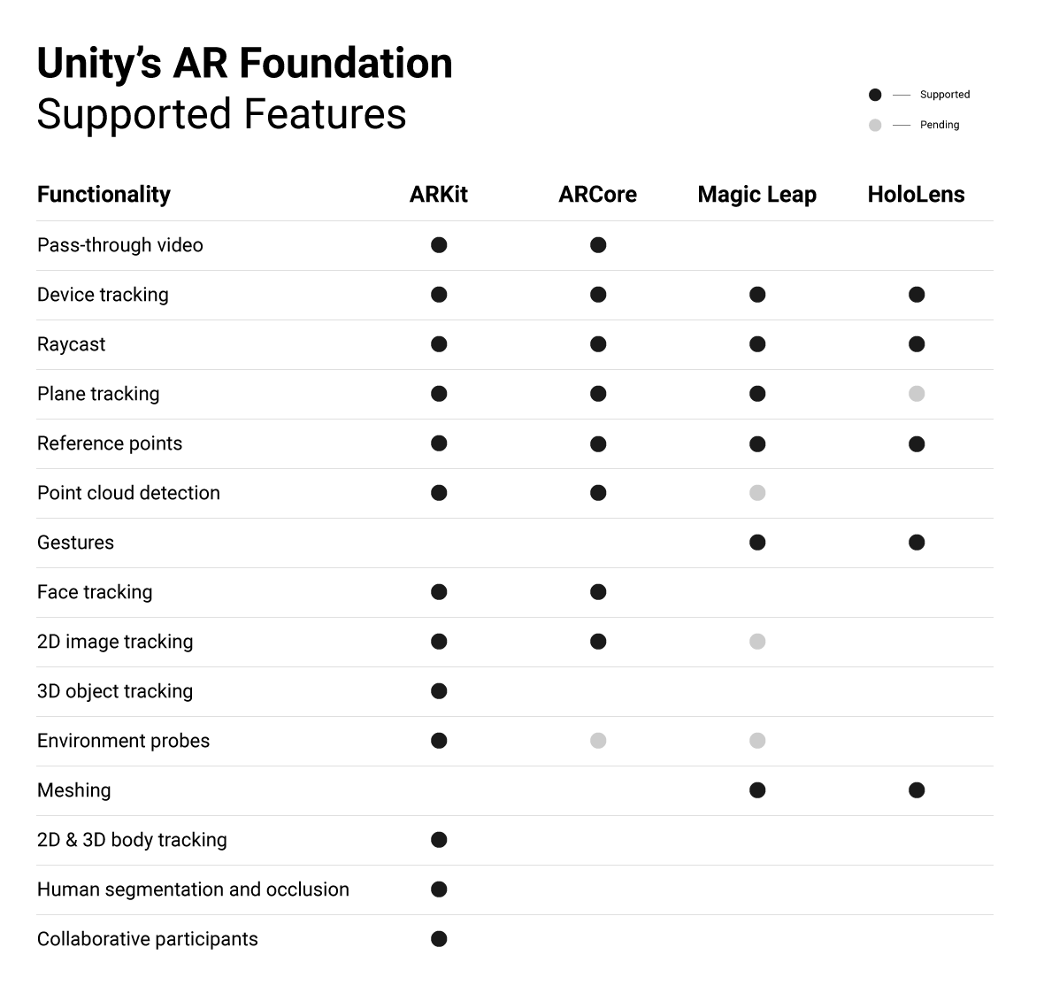 AR Foundation 可跨不同平台支持以下功能: